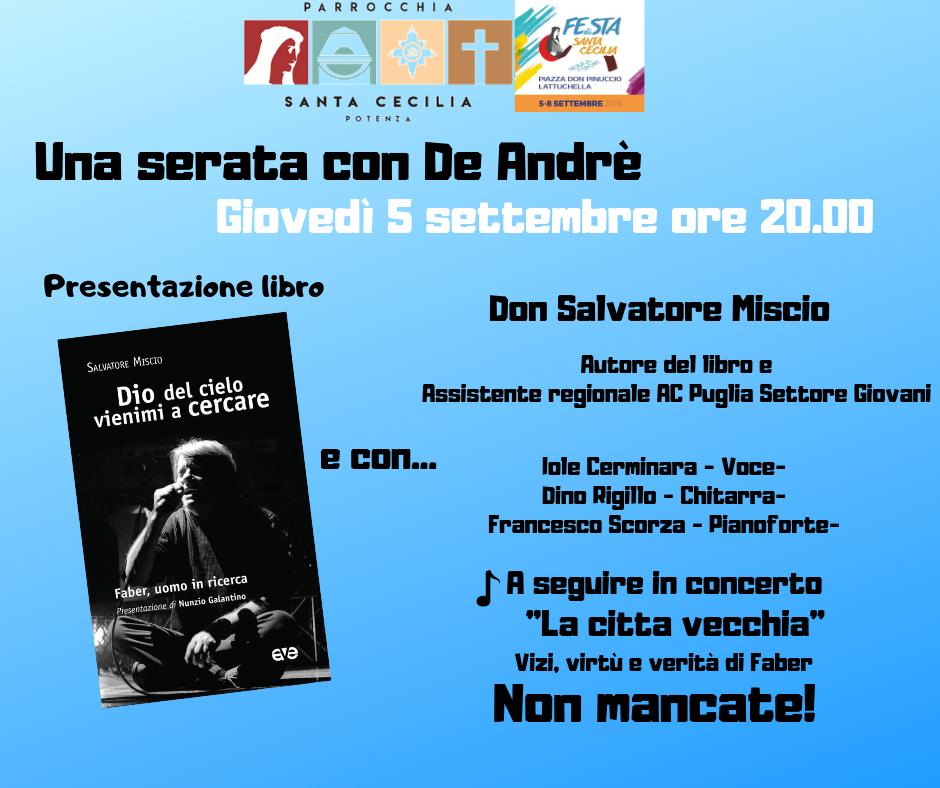 In particolare, Giovedì 5 settembre dalle ore 20 in piazza Don Pinuccio Lattuchella, ci sarà la presentazione del libro Dio del cielo vienimi a cercare per rendere omaggio alla musica di Fabrizio De André.